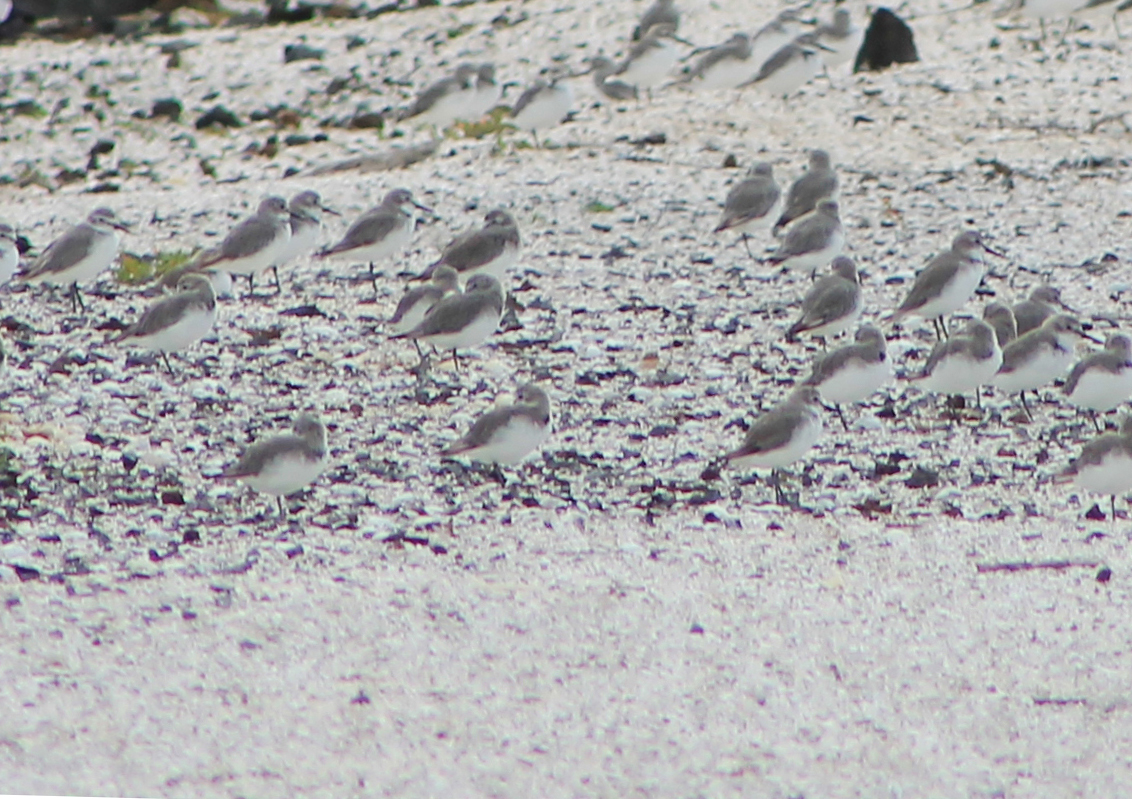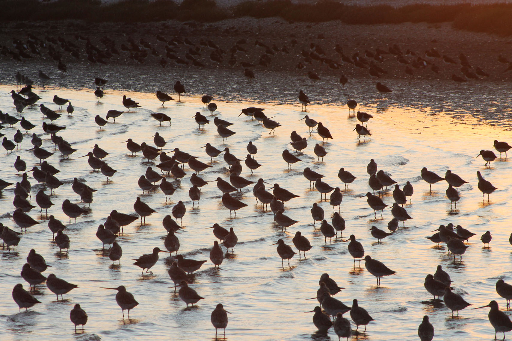 From September to March there are large flocks of Bar Tailed Godwits. These birds are well known for their long migratory flight, the longest non-stop flight of any known bird. Every September these birds fly from Alaska to New Zealand (a journey of around 12000 km). Later around early March they fly back over a period of about 4 months making stops in Australia and the sea between Korea and Japan. They are wading birds so they can not stop on this flight and there is no land to create thermal updrafts. The Godwits fly continuously without gliding at a speed averaging about 80 km/hr.